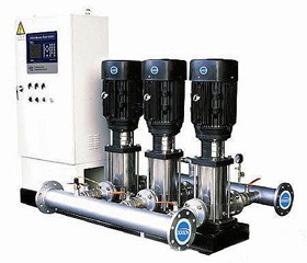變頻恒壓供水設備的基本工作原理是根據用戶用水量變化自動調節運行水泵臺數和一臺水泵轉速,使水泵出口壓力保持恒定。當用戶用水量小于一臺水泵出水量是,系統根據用水量變化有一臺水泵變頻調速運行,當用水量增加時管道系統內壓力下降,這時壓力傳感器把檢測到的信號傳送給微機控制單元,通過微機運行判斷,發出指令到變頻器,控制水泵電機,使轉速加快以保證系統壓力恒定,反之當用水量減少時,使水泵轉速減慢,以保持恒壓。當用水量大于一臺泵出水時,一臺泵切換到工頻運行,二臺泵開始變頻調速運行,當用水量小于兩臺泵出水量時,能自動停止一臺或二臺泵運行。在整個運行過程中,始終保持系統恒壓不變,使水泵始終工作在高校區,既保證用戶恒壓供水,又節省電能。設備不需配備專職操作人員。